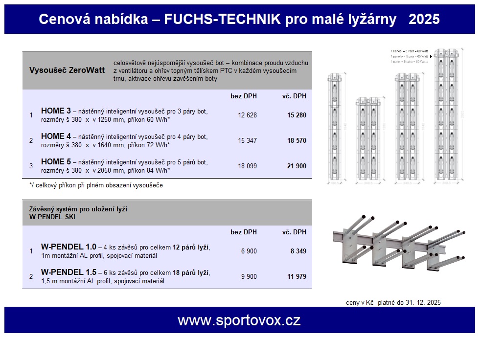 V základní nabídce FUCHS-TECHNIK pro malé lyžárny najdete velikosti vysoušečů pro 3, 4 a 5 párů bot a jednoduchý závěsný systém W-PENDEL SKI o šířce 1 a 1,5 m pro 12 nebo 18 párů sjezdových lyží.